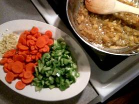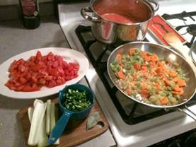 to Esselstyn diet from allrecipes.com) For 3-4 Portions. Prep time 4 hours. Peel Tomatoes Bing a pot of water to a boil Have ready a large bowl of iced water Plunge whole tomato into boiling water for 1 min until skin splits and starts to peel Remove tomato with slotted spoon and place into ice bath for cooling down to be handled Remove skin, cut in half, remove stem roots and squeeze out seeds Puree 8 of the tomatoes with blender Chop vegetables Chop remaining two tomatoes and set aside Chop onion, bell pepper, carrots and garlic Chop fresh basil Cook tomato sauce In large sauce pan, braise onions 3-5 min until soften and browning Reduce heat, deglaze with ½ cup of red wine or low-salt vegetable broth (shown) Add bell pepper, carrots, garlic and cook for 5 min Add pureed tomatoes Stir in chopped tomatoes and basil Add celery stalk and bay leaf Bring to a boil and simmer covered for 2 hours Add tomato paste, fresh or dry oregano and thyme, white pepper Simmer for an additional 1 hour Reduce volume whith cooking uncovered for another hour Finishing up Discard bay leaf, celery and stems if used Add 2 tablespoons of sugar. |