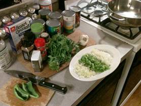 Get in Advance: 1/2 onion, chopped 1/2 green bell pepper, chopped 1 stalks of celery, chopped 1 jalapeno pepper, chopped 3 large gloves of garlic, minced ½ cup of low-salt low-fat vegetable broth 1 Bay leaf ½ teaspoon of cumin 1 tablespoon of dried oregano 2 tablespoons of chili powder ½ of a ¼ teaspoon black pepper 12oz package of vegetarian “ground beef” 8oz kidney beans 8oz garbanzo beans 8oz black beans 16oz whole kernel corn 16 oz fire-roasted diced tomatoes Have On Hand: 1 cup of cilantro, chopped |