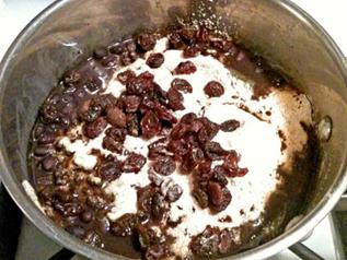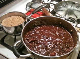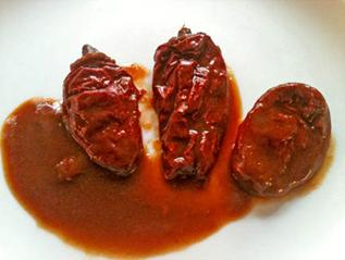 soaking during the night before. Cook the beans In a large pot heat 2 cups of water Add rinsed soaked black beans Add Bay leaf, whole ancho chili, whole jalapeno, and ¼ teaspoon black pepper. Bring to a boil and let simmer covered for 1 hour. Add vegetable broth powder (4 tablespoons) and raisins, and cook for 30 – 60 min until raisings are falling apart. Start the Basmati rice. Add 1 cup of rice to two cups of water, boil and let simmer for 25-30 min. Meanwhile when the beans and raisins are simmering: Braised soft vegetables Chop soft vegetables: Onions, bell pepper, poblano pepper, and garlic In a dry sauce pan braise onions at high heat until browned and softened, Add ½ cup of vegetable broth and solubilize caramelized layer Add chopped bell pepper and poblano pepper and stir for 2 min Add garlic, stir for 30 sec Add all remaining spices and stir for additional 1-2 min. Finishing up Add beans to the braised vegetables Add tomatoes and tomato paste Stir well and simmer for 10 min Meanwhile while simmering: Transfer into blender 4 ladles of the simmering beans with the whole ancho and jalapeno peppers (if still recognizable) Add chipotle chili in adobo with 1 teaspoon adobo sauce Add unsweetened chocolate powder and add agave syrup Blend the mixture to a thick paste. Mix paste into beans, stir thoroughly and let simmer on very low heat for 20 min Adjust consistency of mole by mashing beans with a ladle against the side walls of the cooking pot. Just before serving Remove bay leaf and ancho stem and adjust seasonings: More heat: add more cayenne or adobo. More sweetness: add more agave syrup (I added 3 teaspoons). Serving: Serve hot right away. Or place in the fridge overnight, and reheat very slowly again (may be in a crook pot) before serving which will considerably enhances the taste. Serve with tofu sour cream (070), hot tortillas, brown rice, toasted whole wheat bread or crisp bread |