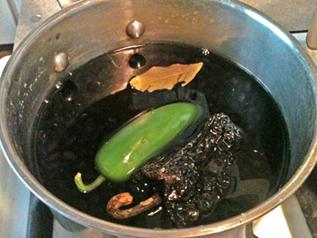 Get in Advance: Use for reduced hotness For the beans: 1 cup dry black beans (optional 2 15-oz canned black beans) 2 cups of low-salt low-fat vegetable broth 1 bay leaf 1 ancho (dried poblano) chili (see at right) , stemmed [1/2 seeded] 1 fresh whole jalapeno pepper (see at right), stemmed [1/2 seeded] ¼ teaspoon ground black pepper ¼ cup of dark raisins For the sauté: 1 large onion, chopped ½ green bell pepper, chopped 1 poblano pepper (see at right), stemmed, seeded, and chopped [1/2] 2 garlic cloves, coarsely chopped ½ tablespoon cumin seeds 1 teaspoon coriander seeds 1 teaspoon ground cumin 1 teaspoon ground coriander ¼ teaspoon dried oregano ½ of ¼ teaspoon cayenne pepper ½ of ¼ teaspoon anise seeds 2 pinches ground cinnamon 1 pinch ground cloves 1 teaspoon Hungarian paprika ½ tablespoon hot chili powder For the finish: 16 oz fire roasted chunked tomatoes with juice ½ of ¼ cup of tomato paste 1 tablespoon unsweetened chocolate powder 1 chipotle chili in adobo (see at right), stemmed, with 1 teaspoon adobo sauce [1/2 without additional sauce] 1 teaspoon agave syrup or honey Have Prepared the night
