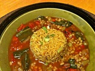 A delicious Louisiana gumbo prepared with a dark “roux” made from braised onions, beer and barley used as thickener as well as for white meat replacement. The full-bodied Cajun flavor and the supple texture and refreshing slight bitterness of the greens provided for a feast. |